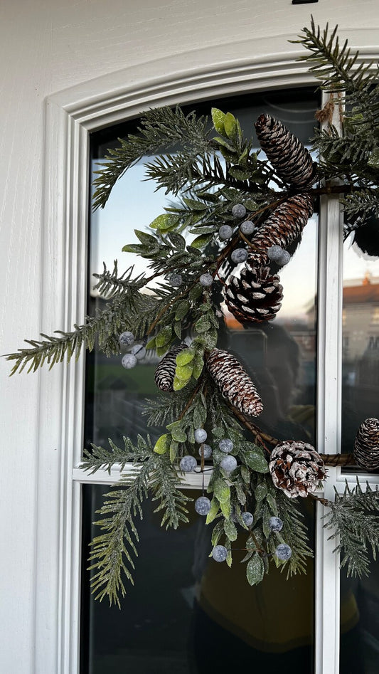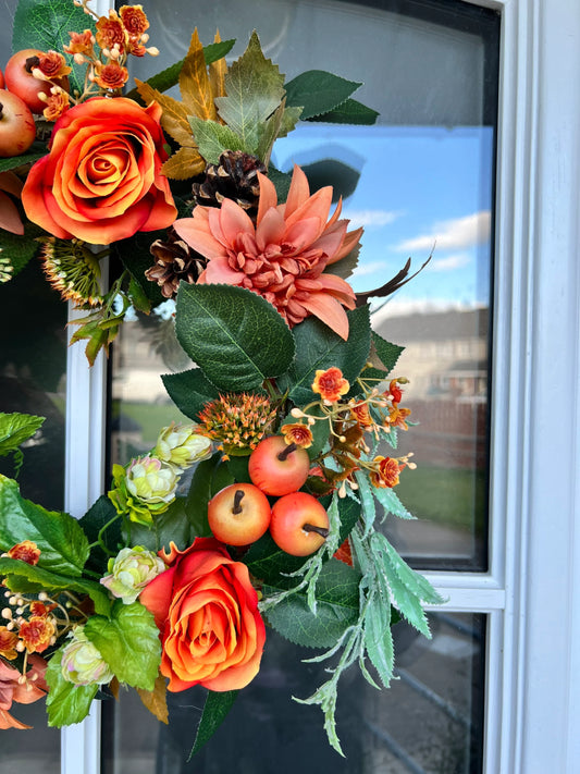 Green and orange artificial flower wreath. Roses Apples Poppy head Pinecone 45cm (18”)