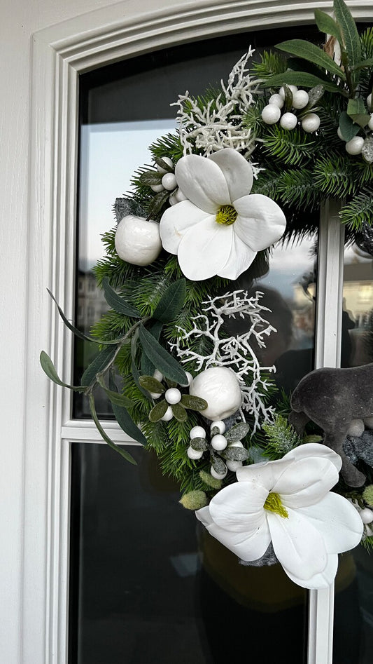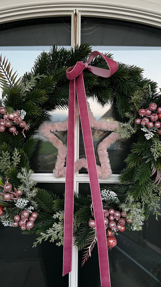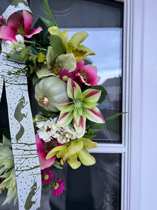 Summer/Autumn artificial flower wreath. Clematis Dahlia Pumpkin Anemone Daisies Baby’s breath Orchid Fern leaves Jasmine Berries