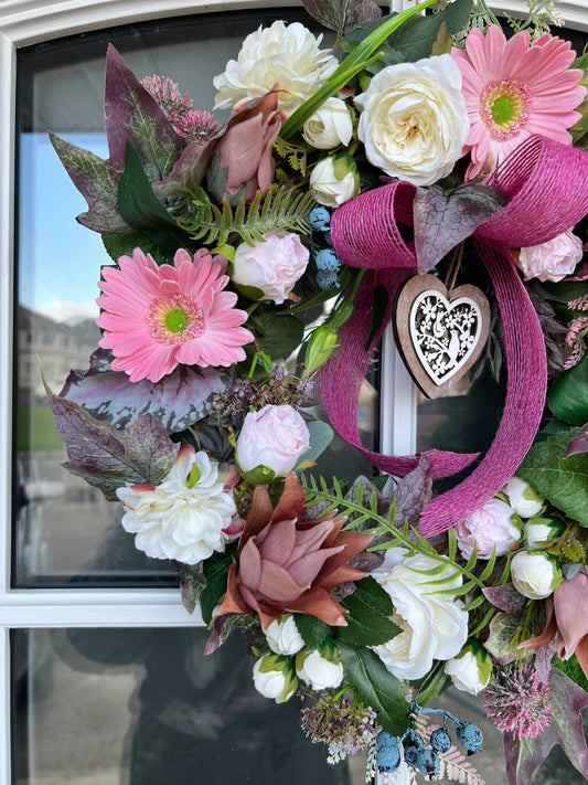 Summer/Autumn artificial flower wreath. Gerbera Roses Berries Dahlia Fern leaves Thistles Leaves